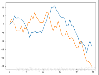 # 随机漫步from randomMy import RandomWalkimport matplotlib.pyplot as plitrwn = RandomWalk()rwn.fill_walk()# plit.scatter(rwn.x_values, rwn.y_values, s=15) #点图1plit.plot(rwn.x_values) #线图2plit.plot(rwn.y_values) #线图2plit.show()